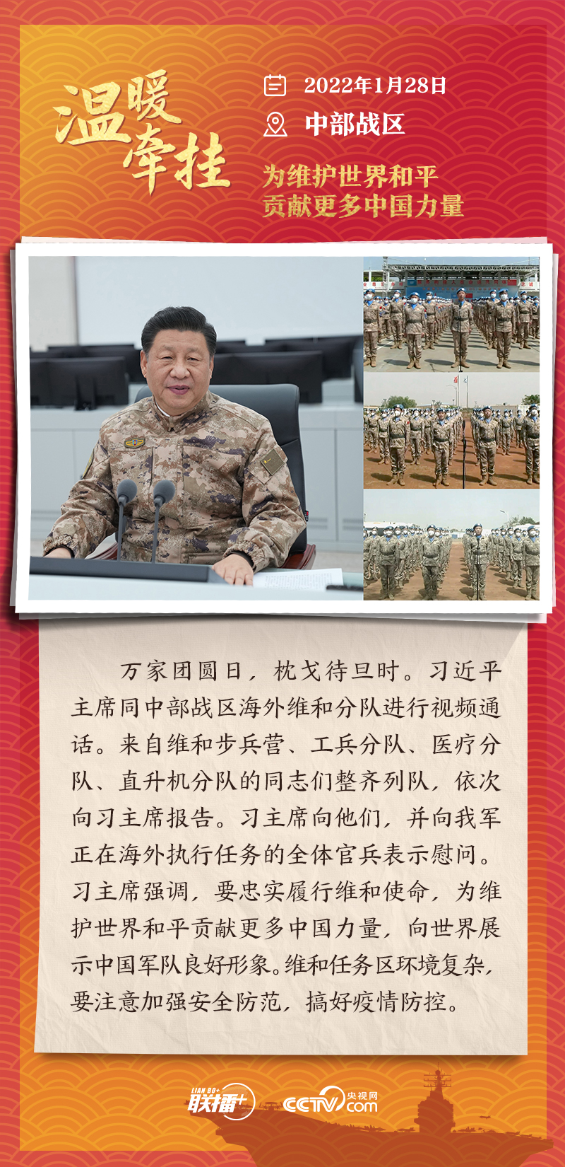 联播+踏边关、走戈壁、入班排、看哨所……党的十八大以来,每逢新春佳节到来之际,即使行程再满,习近平主席也会留出时间来到军营、训练场或边防线,看望或亲切接见驻地部队官兵,代表党中央和中央军委,向全体人民解放军指战员、武警部队官兵、民兵预备役人员致以诚挚问候和新春祝福。