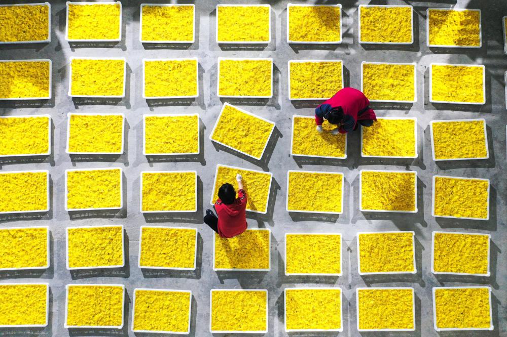 村民在贵州省贵定县云雾镇一菊花加工车间摊晾金丝皇菊(2022年10月20日摄,无人机照片)。新华社记者 杨文斌 摄