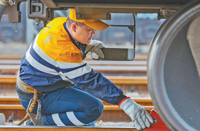 杨智在检查列车防溜设备。本报记者 张枨/摄