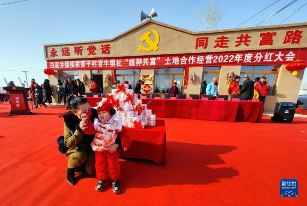 1月17日,村民在内蒙古自治区鄂尔多斯市达拉特旗白泥井镇侯家营子村官牛犋社分红现场留影。 新华社记者 贾立君 摄