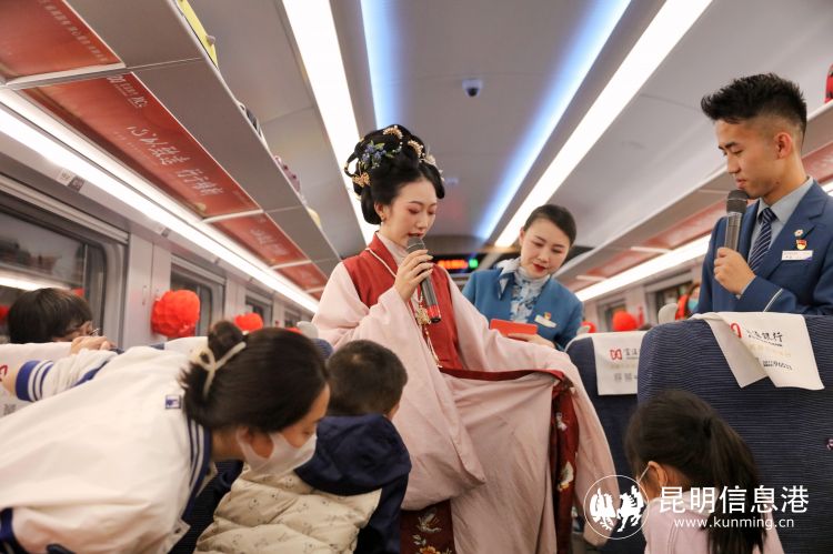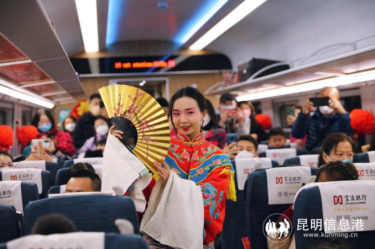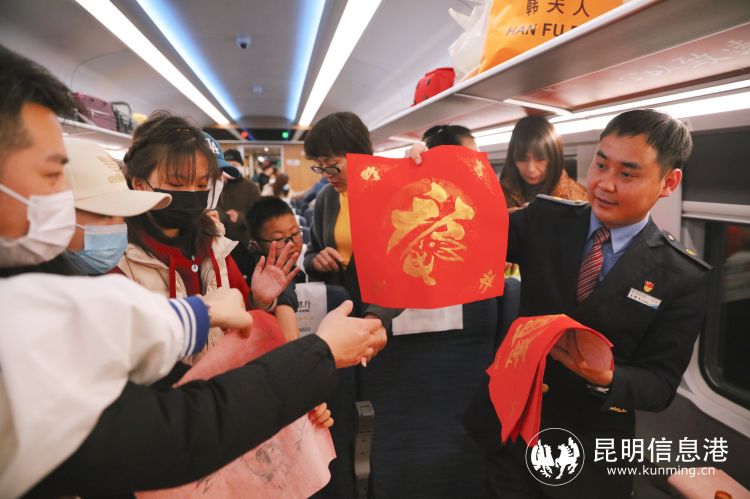 车厢里,傣族舞蹈、国粹京剧、老挝舞蹈、汉服双人舞、合唱《我和我的祖国》、茶艺、现场写春联送福字陆续登场。每一个节目都给旅客带来了欢乐,车厢里不时传出一阵阵笑声。