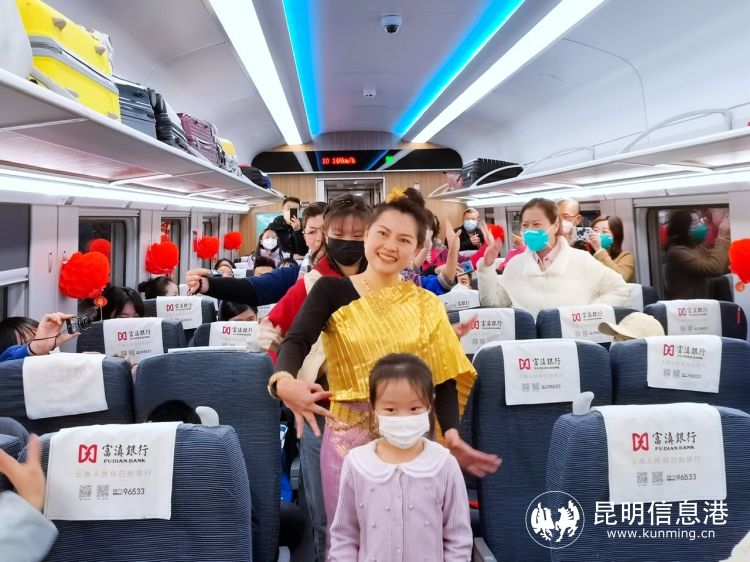 10时许,随着《让我听懂你的语言》音乐的响起,身着民族服饰的傣族姑娘依波逢和朋友翩翩起舞,C272次动车组列车10号车厢内顿时热闹起来。