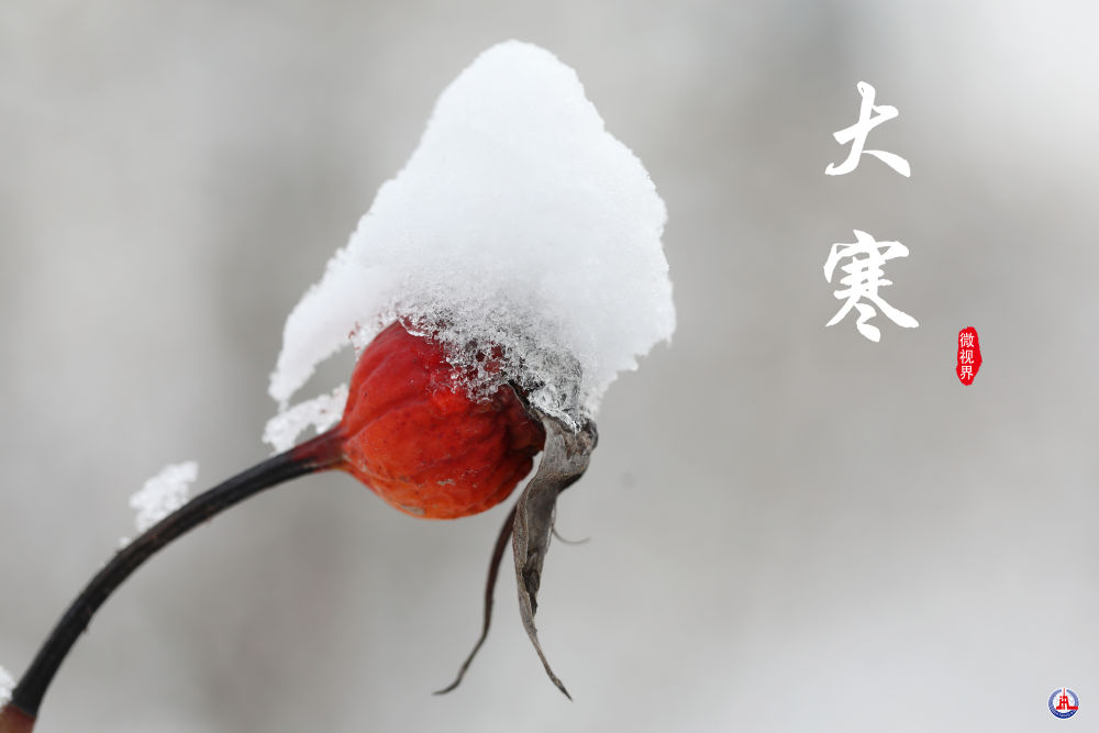 ↑河南省焦作市温县,月季花果实与白雪相映成趣。新华社发(徐宏星 摄)