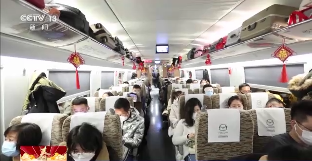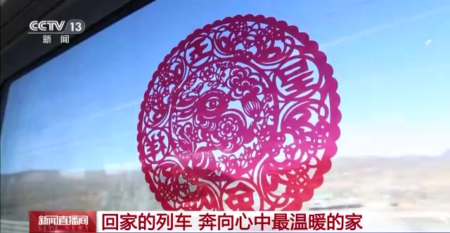 春节临近,列车上也是精心布置一番,挂上了装饰、贴上了福字,充满浓浓的年味。车厢里既有带着孩子回家看老人的家长,也有放假回老家的孩子。