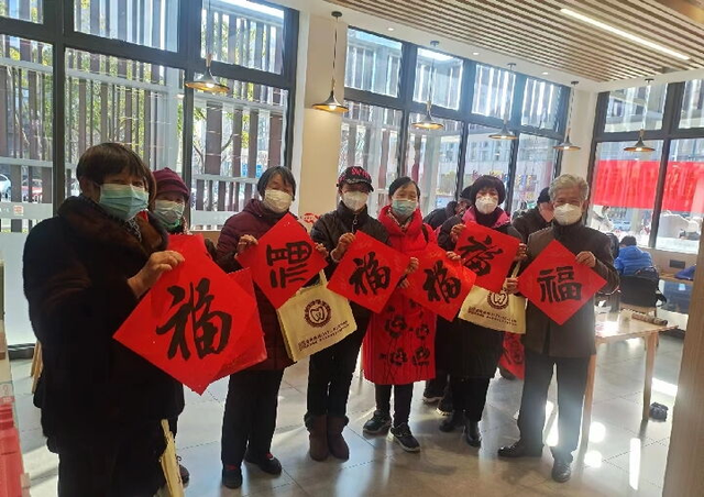 没过多久,驿站越发热闹起来。嘉兴市书法家协会的老师们现场写福字、送祝福,附近工作、居住的市民全都闻风而来。驿站里墨香四溢,包括老李在内的许多老人,拿到“福”字后都高兴地拍照发到朋友圈。