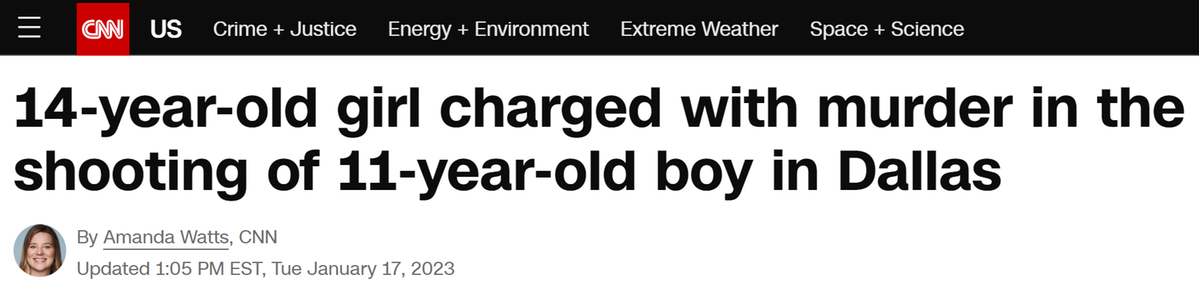 据美国有线电视新闻网(CNN)近日报道,美国得克萨斯州达拉斯市的一名14岁女孩在与另一名女孩的争执中朝对方开枪,却意外击中了一名旁观的11岁男孩。目前,涉事女孩已被控谋杀罪。