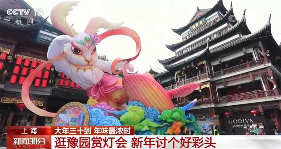 大年三十的上海豫园,人们逛灯会、走九曲桥、品城隍庙美食。截至今天,兔年豫园灯会共吸引游客超过170万人次,单日最高客流达到44万人次。在中心广场,一只玉兔彩灯飞天东升,它的形象是模仿敦煌飞天的仙女造型,一旁还可以看到鲲鹏彩灯扶摇直上。春节期间,豫园推出了许多主题集市活动以及多种主打兔子形象的单品,为消费者营造出浓浓的节日氛围。