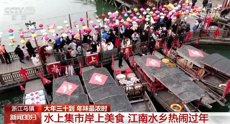 在浙江乌镇,处处也都是年味。水上集市是乌镇的一大特色,每一艘船就像是一个专卖店,来来往往的游客不管是坐船还是在岸上,都可以随时选购商品。水上集市的兴起源于乌镇临水而居,乌镇人出行和买卖曾经都是通过船来进行。
