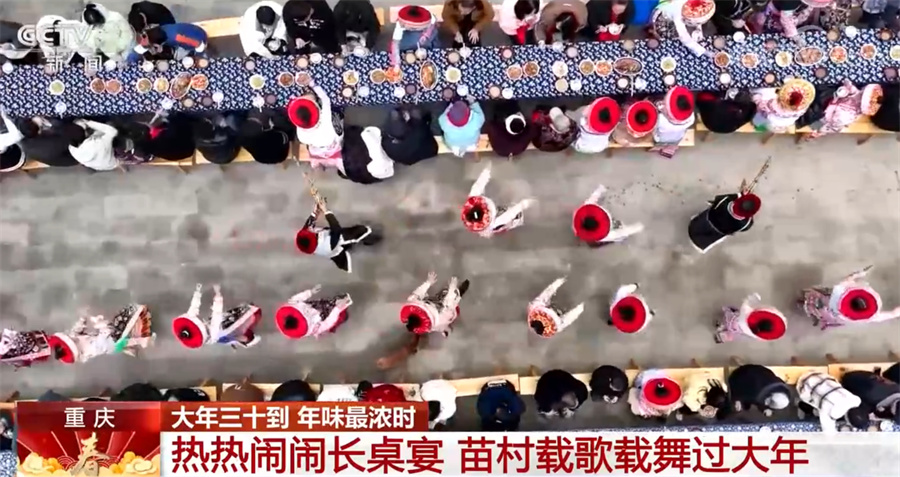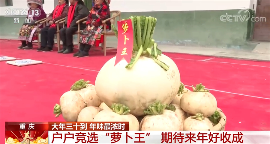 在重庆市綦江区赶水镇的梅子村,这里的居民90%以上都是苗族同胞。大年三十,当地150多位村民一起忙着准备中午的团年饭。除了宰牛烹羊,萝卜也是长桌宴上的一大美食元素。萝卜是当地的支柱产业,家家户户几乎都会种萝卜,整个綦江区种植了超过10万亩草蔸萝卜。每年的长桌宴上,各家都会带来自家最大的萝卜来赴宴,村里德高望重的老人会根据个头、重量和品相评选出今年村里的“萝卜王”。