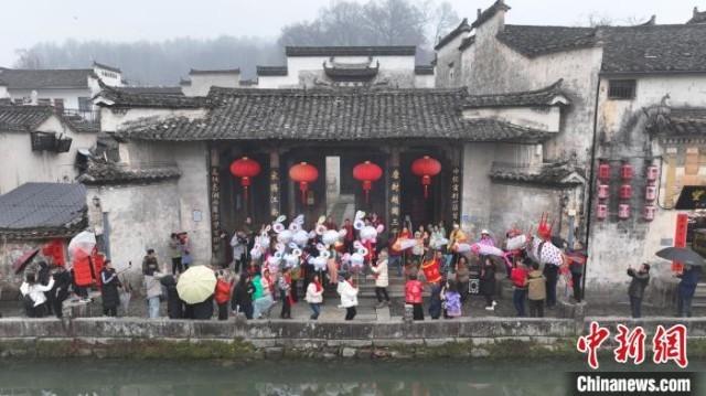 大年初一,游客和花灯队队员在黄山市黟县宏村乐叙堂前舞兔灯。 方龙 摄