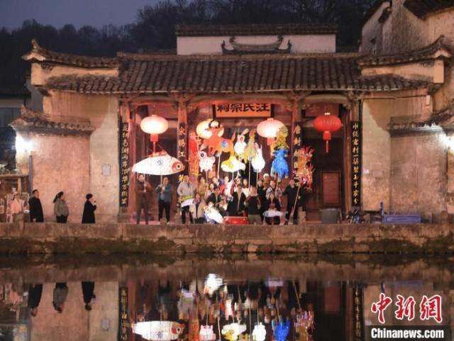 大年初一,游客和花灯队队员在黟县宏村月沼舞兔灯。 方龙 摄