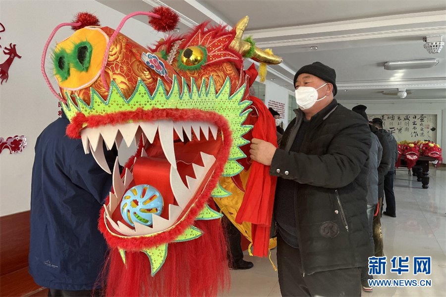 甘河子镇居民正在做舞龙前的准备工作。新华网发 张婧摄