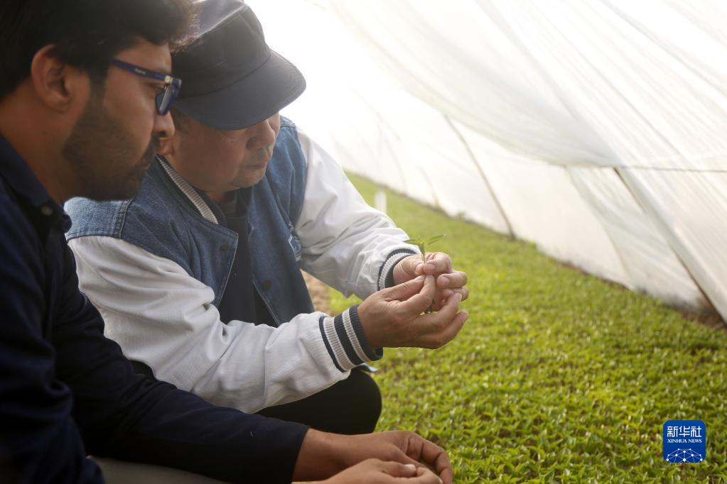 1月16日,在位于巴基斯坦旁遮普省木尔坦的中巴辣椒订单种植项目辣椒育苗大棚内,中国农业专家赵建华(右)带领巴基斯坦技术员萨贾德查看辣椒秧苗生长情况。新华社发(艾哈迈德·卡迈勒摄)