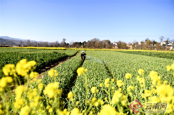 1月30日,巍山县庙街镇新华村委会大甘庄村村民在油菜花田间开展蔬菜病虫害防治。人勤春来早。