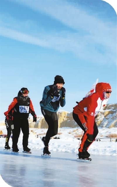 一月二十七日,新疆维吾尔自治区第一届冬季运动会冰雪全能超强赛(福海站)在新疆福海县乌伦古湖海上魔鬼城景区举办。阿尔达克·拜斯汗摄(人民图片)