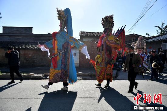 1月31日,福建省福州市长乐区潭头镇厚福村举行传统民俗文化活动。厚福村是福建著名侨乡,该村民俗文化活动于每年正月初十及正月二十六举行,至今已有400多年的历史。活动举行期间,全体村民踊跃参与,祈福国泰民安、风调雨顺。图为民俗文化活动中的巡游队伍。