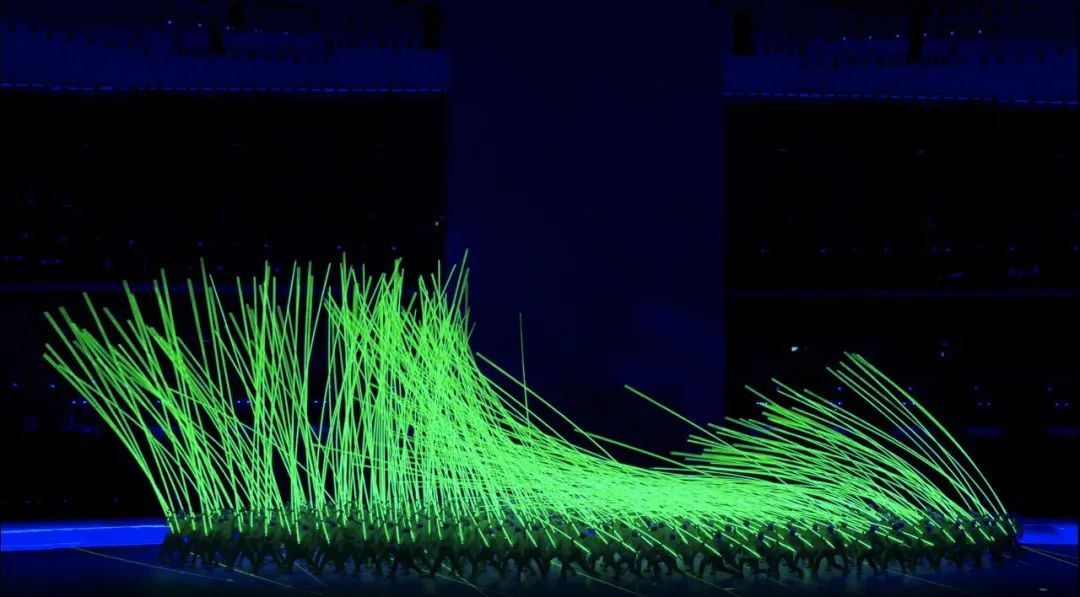 冰雪五环是全球最大的立方体发光装置。它链接物理装置、五维影像、激光追踪、舞美编排等要素,也是开幕式中最具挑战性的多维度创新环节。