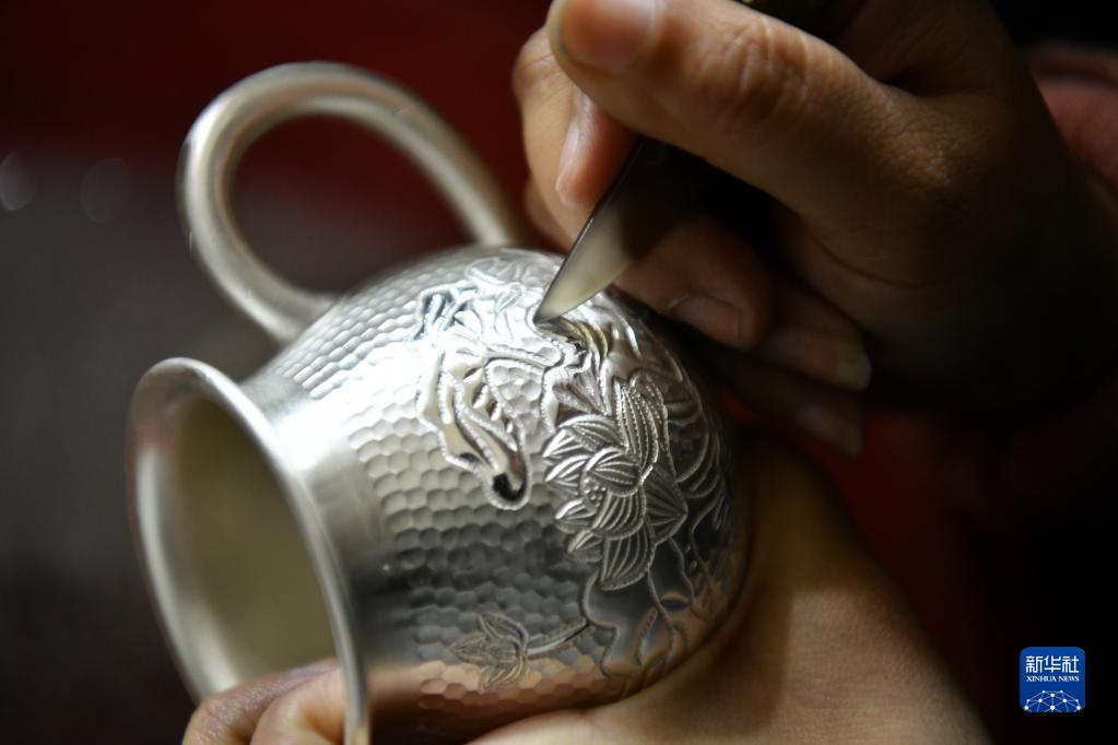 近年来,河北省沧县深入挖掘特色文化资源,积极推动传统制银技艺走规模化生产经营道路,形成集设计、生产、加工、销售于一体的特色银器产业,银器制品畅销海内外,有效带动当地群众增收。(新华社 记者牟宇 摄)