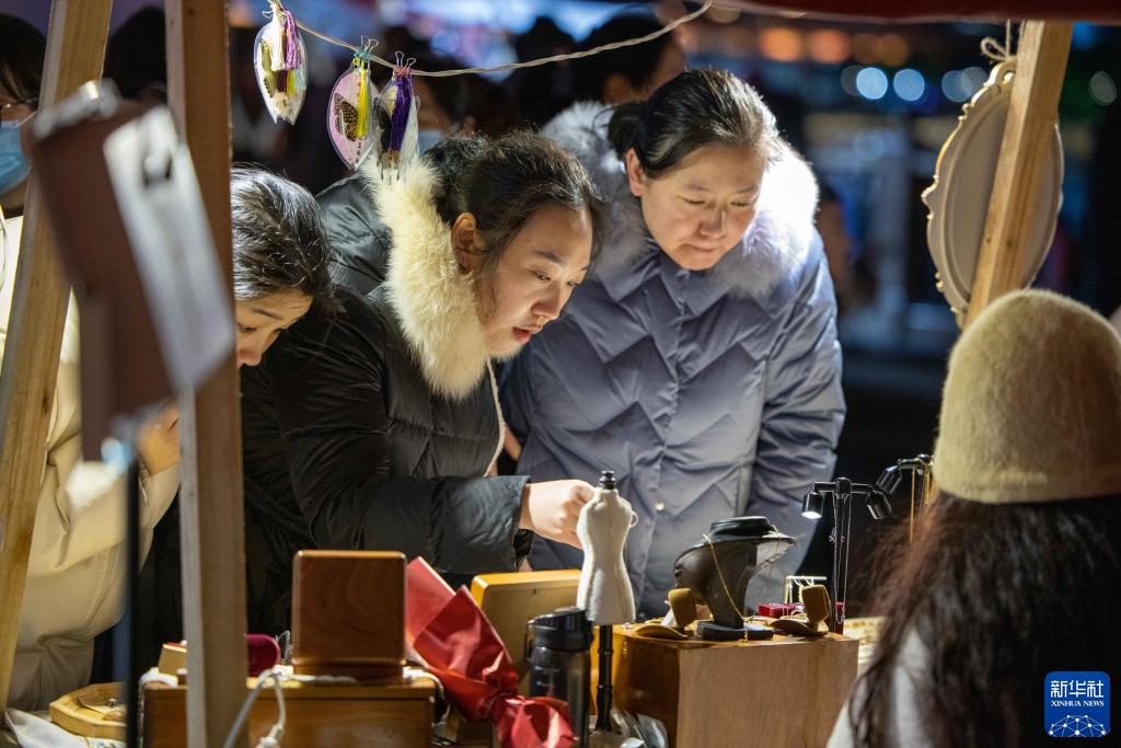 2月15日,游客在宁波老外滩步行街夜集市上挑选饰品。 新华社记者 江汉 摄