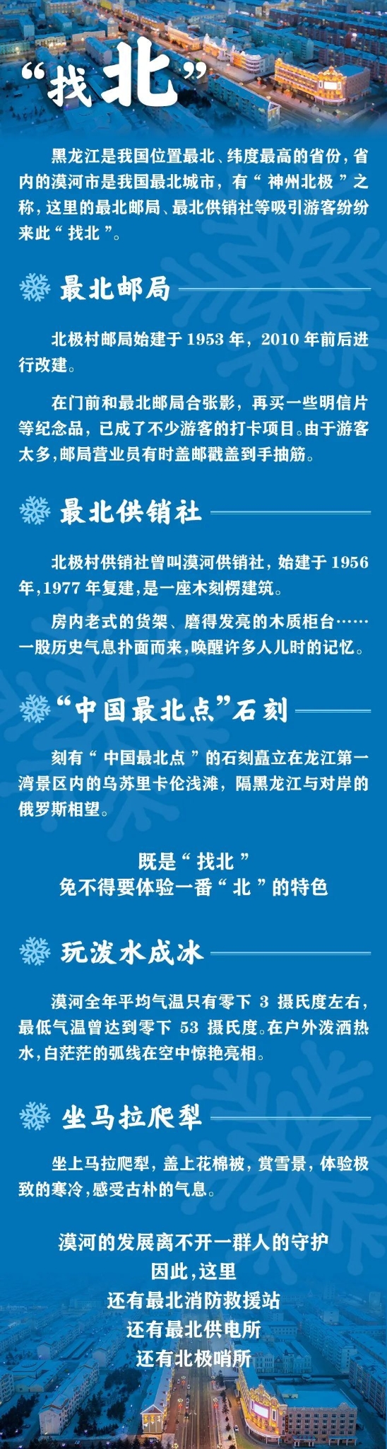 在我国最北端的漠河市,最北邮局、最北供销社、最北照相馆等吸引游客纷纷来此“找北”;大庆市肇源县举办首届冰雪节,黎明湖龙舟冰雪乐园开园,开展冰上龙舟邀请赛;伊春市举办森林冰雪欢乐季、森林泼雪节等活动……黑龙江省开展线上线下相结合的各类惠民演出,推出“冰晶雪舞欢乐季”,累计举办各类活动1079场,参与者超5万人,受众达68万余人。