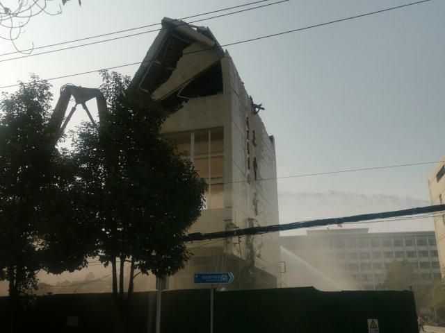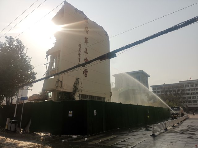拆除现场拉起警戒线,车辆行人途径时需靠道路另外一侧通行。还有洒水喷淋紧跟建筑拆除,扬尘并不明显。