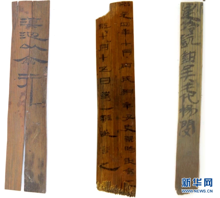 河泊所遗址出土的三枚有字简牍。(云南省文物考古研究所 供图)
