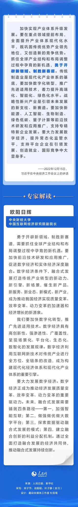 2月16日出版的第4期《求是》杂志发表中共中央总书记、国家主席、中央军委主席习近平2022年12月15日在中央经济工作会议上重要讲话的一部分《当前经济工作的几个重大问题》。讲话指出“抓住全球产业结构和布局调整过程中孕育的新机遇,勇于开辟新领域、制胜新赛道”。人民网邀请专家进行解读。