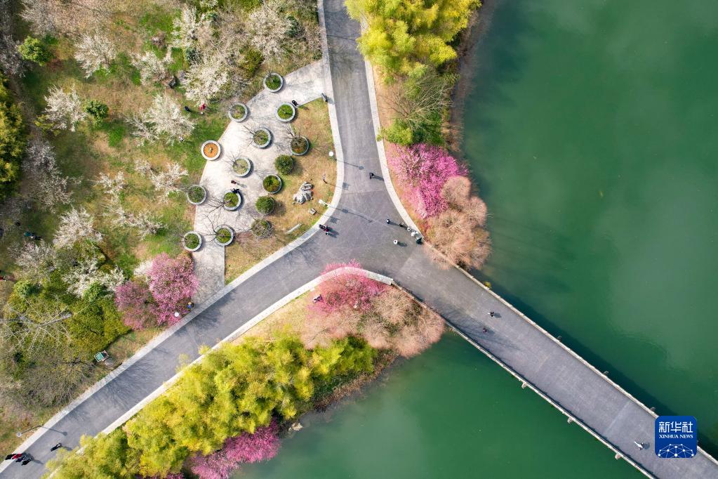 2月26日,游客在贵州省遵义市新蒲新区湿地公园赏花游玩(无人机照片)。