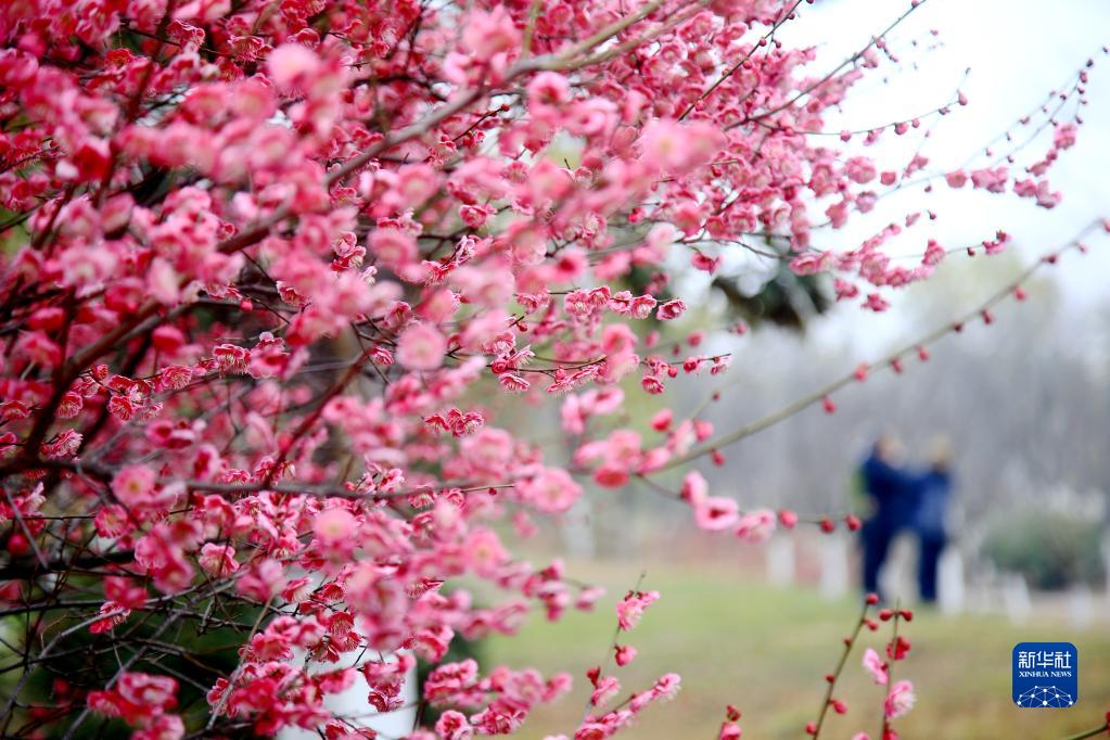 2月26日,游人在湖北省十堰市郧阳区柳陂公园观赏梅花。