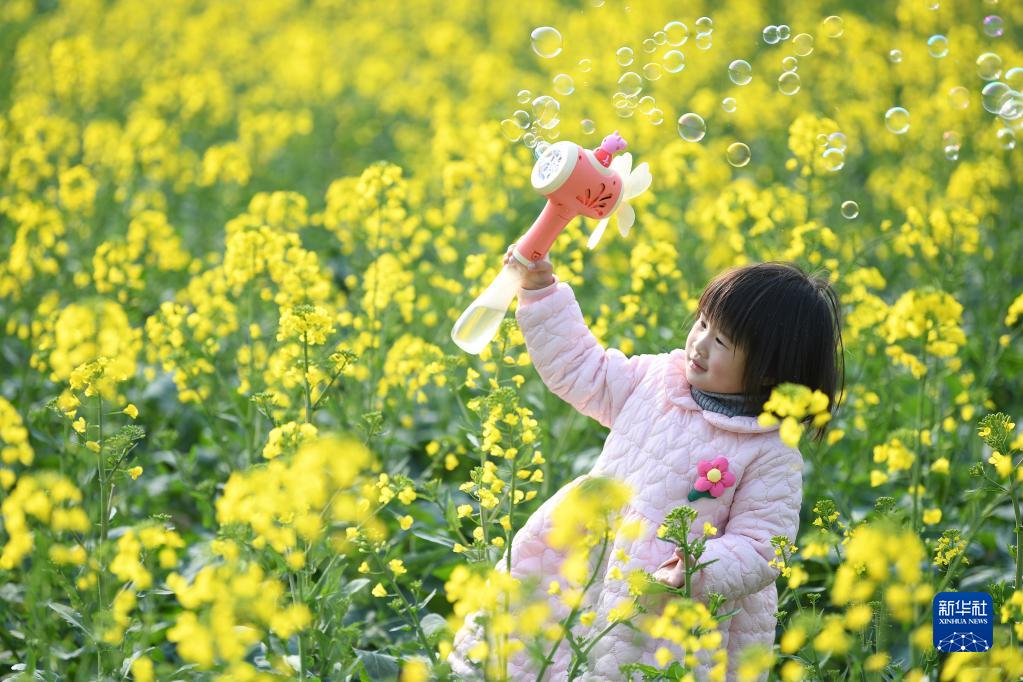 2月26日,一名小朋友在贵州省遵义市余庆县白泥镇满溪村油菜花田间游玩。