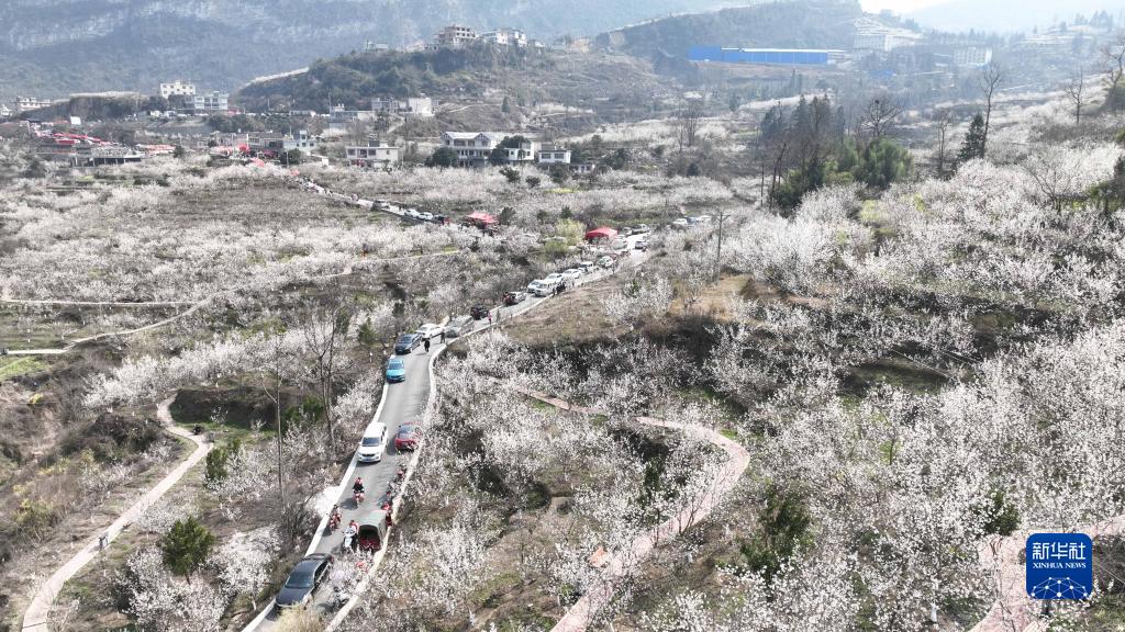 2月26日,游客在贵州省毕节市织金县马场镇中心村樱桃基地赏花游玩(无人机照片)。