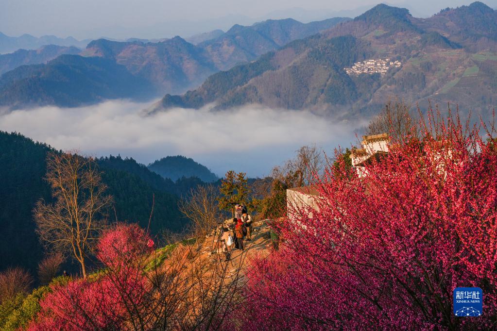 2月26日,游人在安徽省歙县霞坑镇石潭村观赏梅花、云海美景。