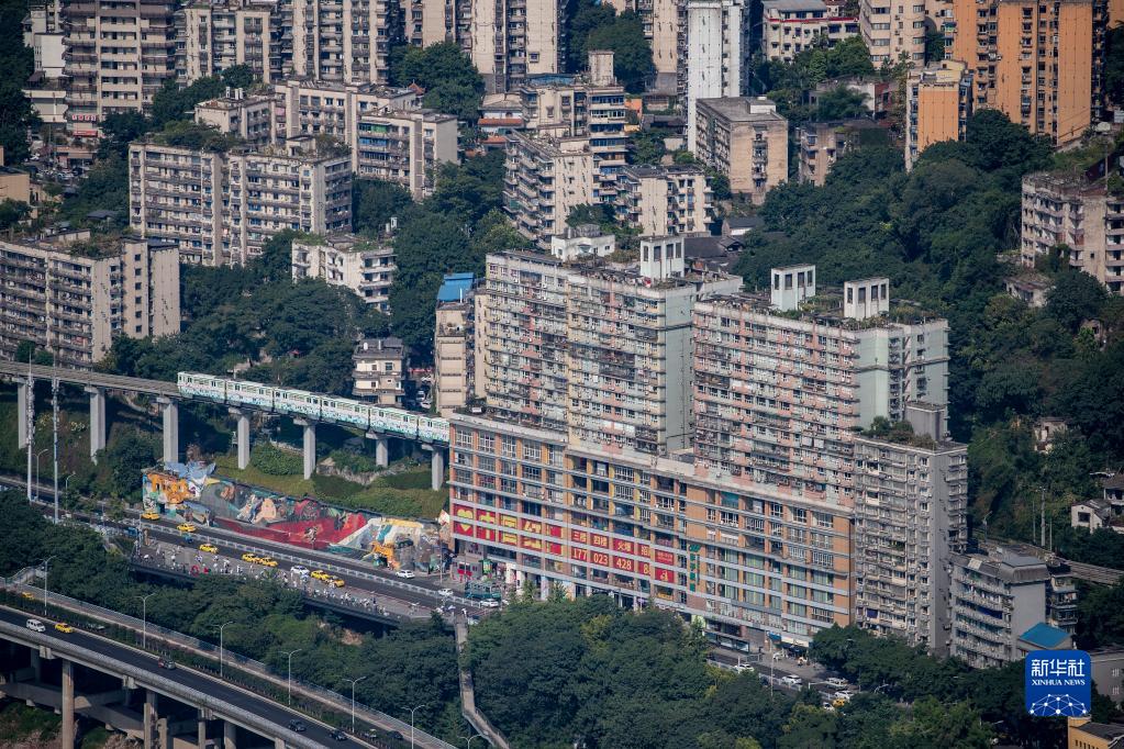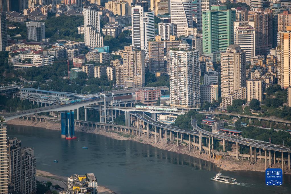 这是2022年7月13日拍摄的运营中的重庆轨道交通2号线列车(右下)和3号线列车(左上)。