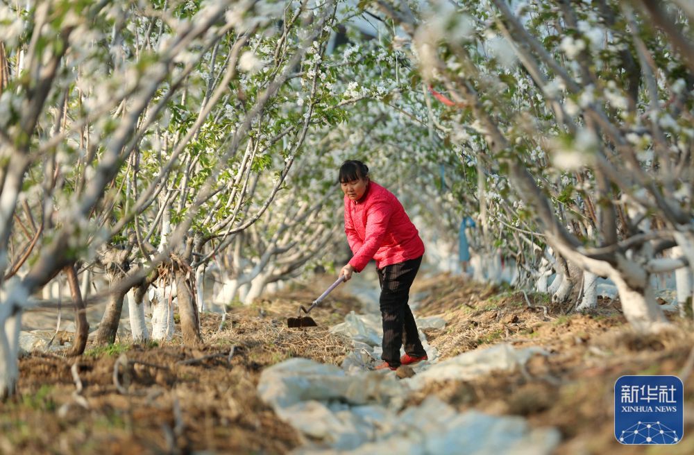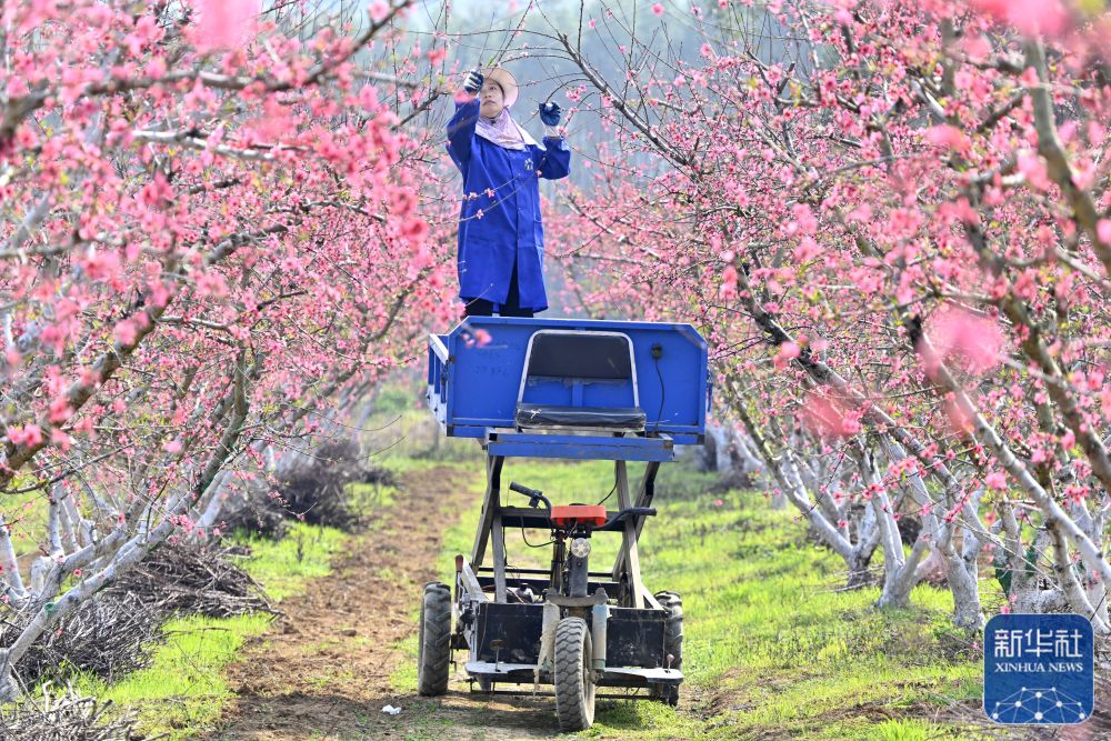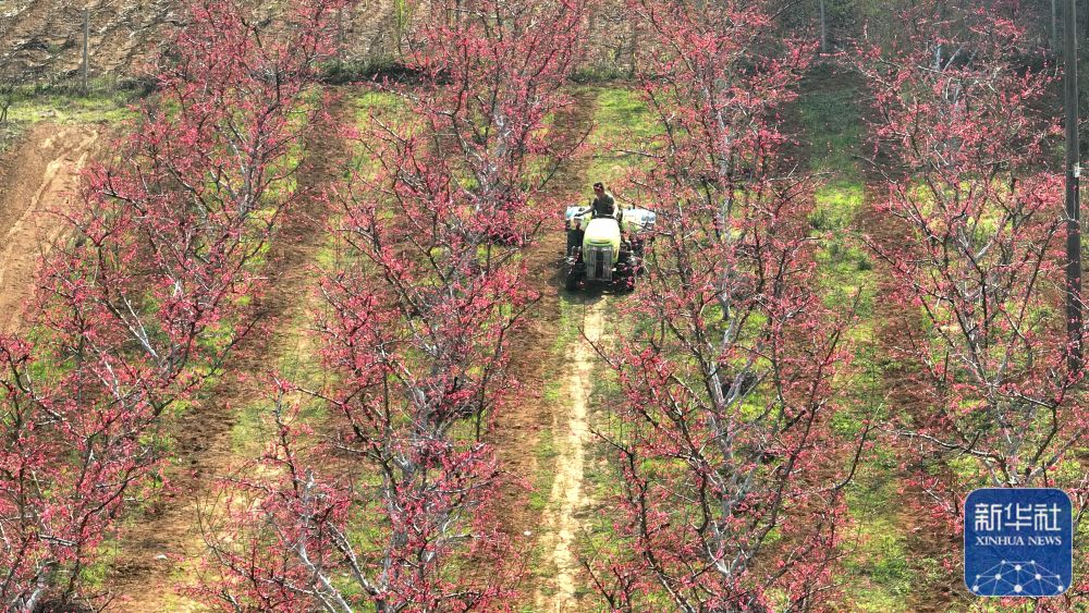 ↑2月28日,村民在广西柳州市柳江区穿山镇林寺村鹰嘴桃种植基地进行桃园管护作业。新华社发(黎寒池 摄)