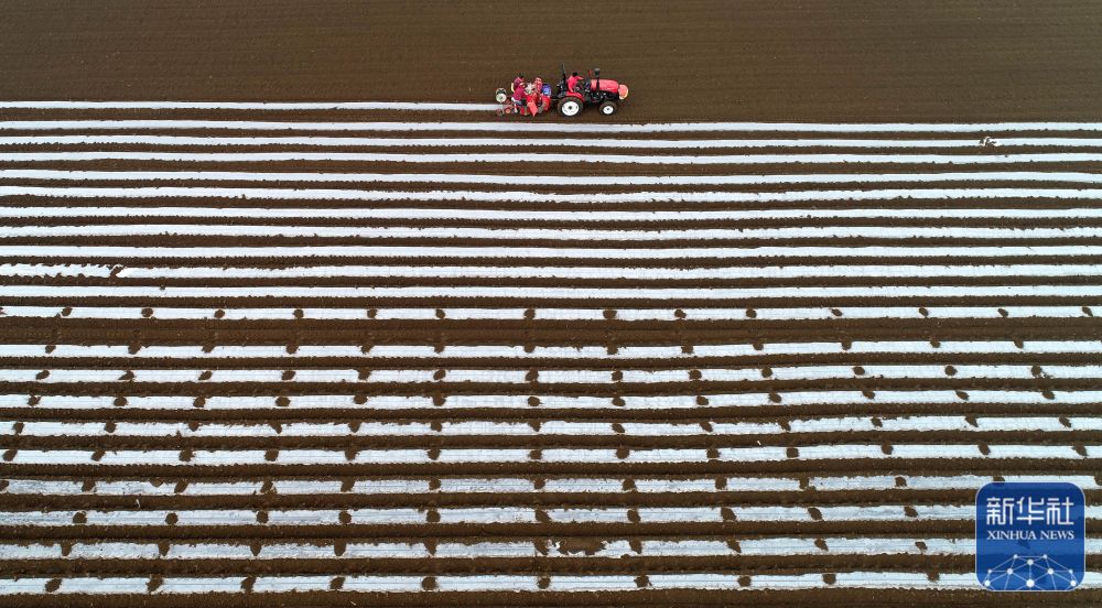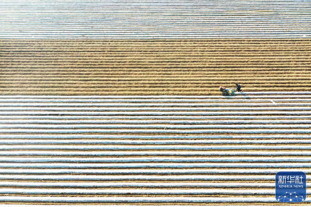 ⬆️2月27日,山东枣庄山亭区户口村农民驾驶农机在田间覆膜播种马铃薯(无人机照片)。新华社发(李宗宪摄)