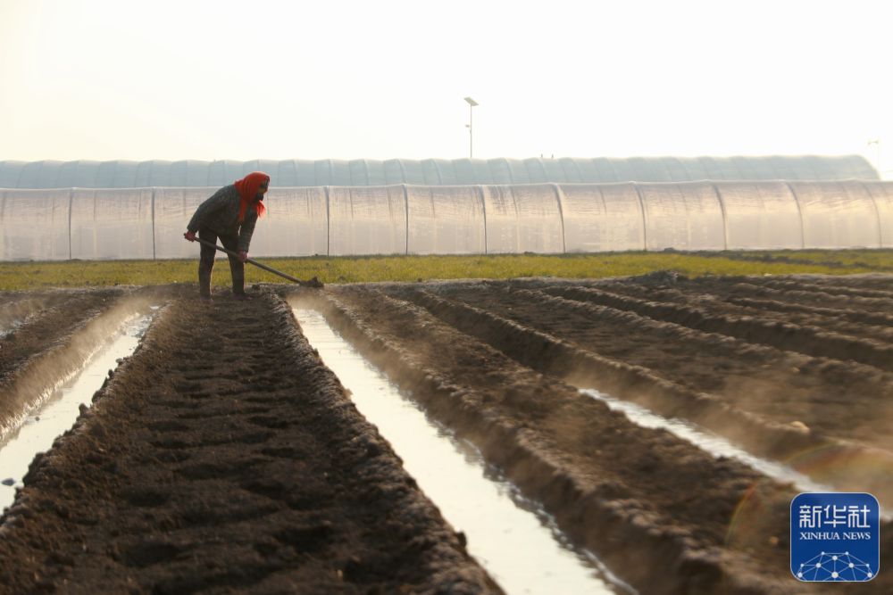 2月28日,农民在江苏省昆山市锦溪镇欧富乐农业科技有限公司农场锄草。新华社发(王须中摄)