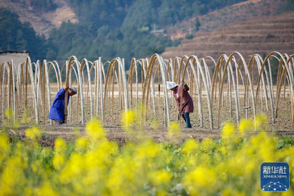 ⬆️2月27日,瓜农在贵州省黔东南苗族侗族自治州丹寨县兴仁镇城江村西瓜田间搭建瓜棚。新华社发(黄晓海 摄)