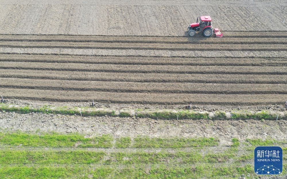 ⬆️2月27日,在湖南省永州市道县清塘镇陈熊村,农机手驾驶拖拉机在耕地(无人机照片)。新华社发(何红福摄)