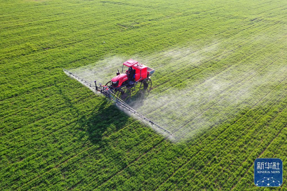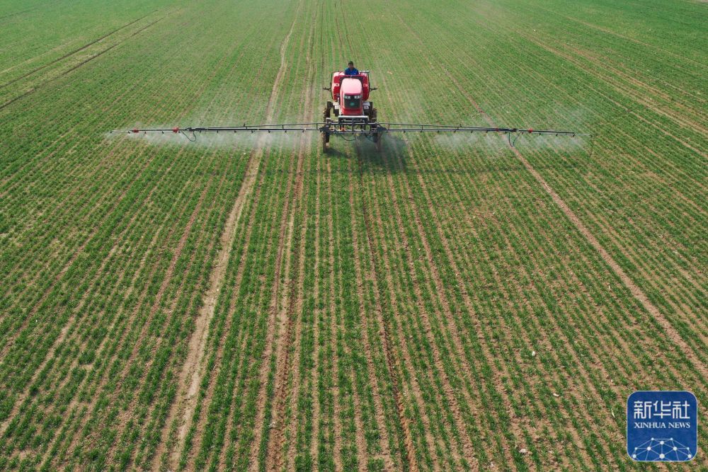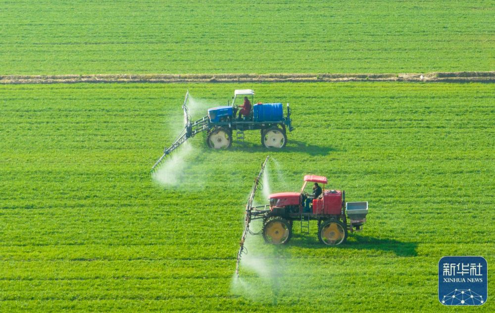 ⬆️2月27日,河南省焦作市温县永生农业植保专业合作社植保队员驾驶农机在给小麦喷施叶面肥(无人机照片)。新华社发(徐宏星摄)