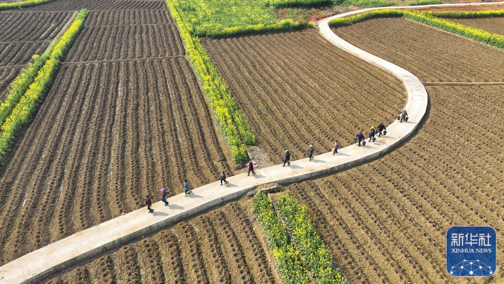 ⬆️2月27日,湖南省常宁市西岭镇六图村农民行走在前往田间施肥的路上(无人机照片)。新华社发(周秀鱼春摄)