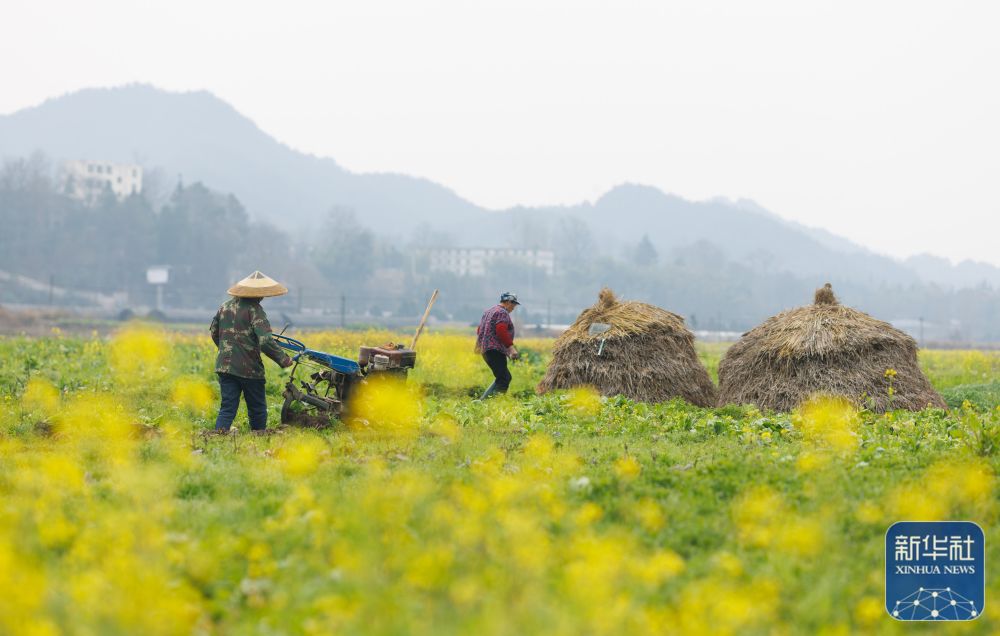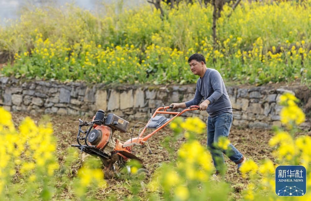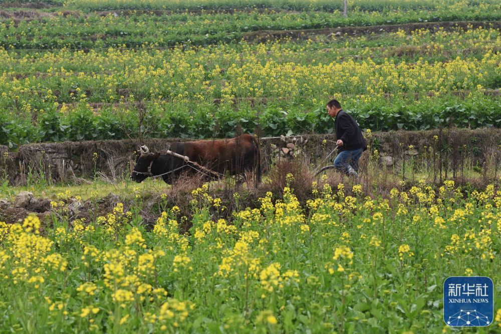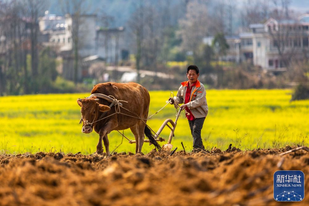 2月28日,在湖南省怀化市通道侗族自治县万佛山镇杏花村,农民在翻耕田地。新华社发(粟勇主摄)