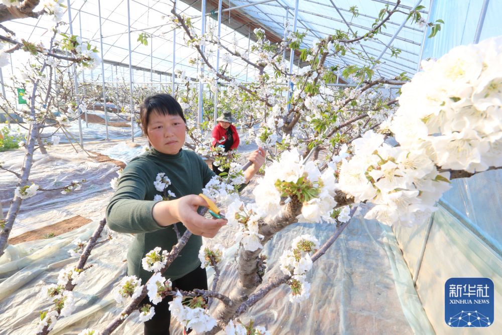 ⬆️2月27日,山东省枣庄市山亭区翼云诚信家庭农场的果农为大棚里的樱桃花进行疏花。新华社发(刘明摄)