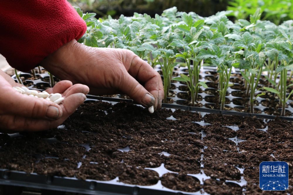 2月28日,山东省滨州市惠民县淄角镇狮豹刘村农民在育苗大棚内播种芸豆种子。新华社发(初宝瑞摄)