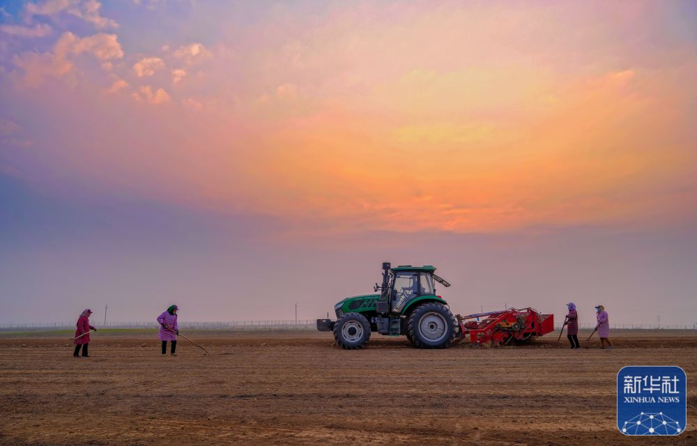 2月28日拍摄的陕西省渭南市合阳县和家庄镇故池村中药材种植基地机械收获场景。新华社发(赵哓罡摄)
