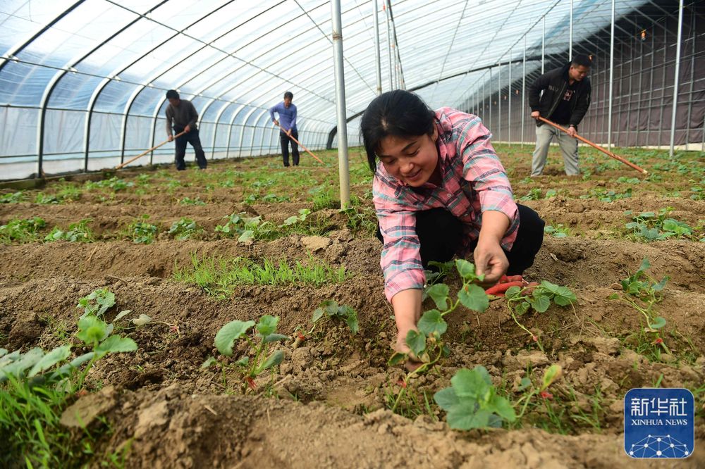 2月28日,在河北沧县刘家庙乡刘浩屯村果品生产基地,农户在大棚内进行甜瓜除草工作。新华社发(傅新春摄)