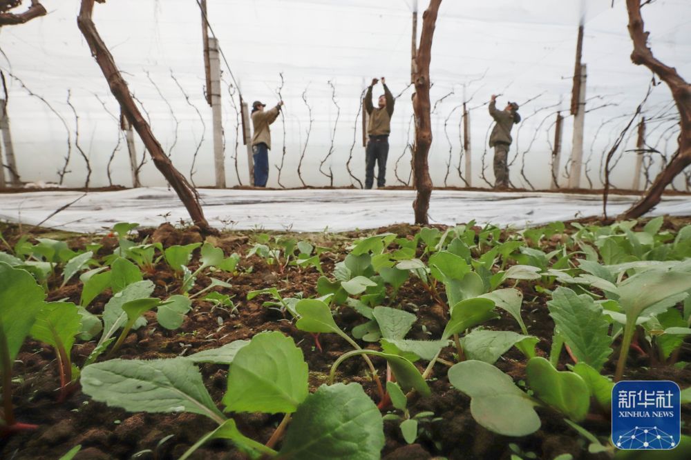 2月28日,河北省遵化市侯家寨镇农民在大棚绑扎葡萄藤蔓。新华社发(刘满仓摄)
