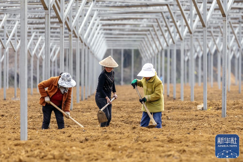 2月27日,村民在贵州省黔西市林泉镇清塘村蔬菜种植基地平地起垅。新华社发(范晖 摄)