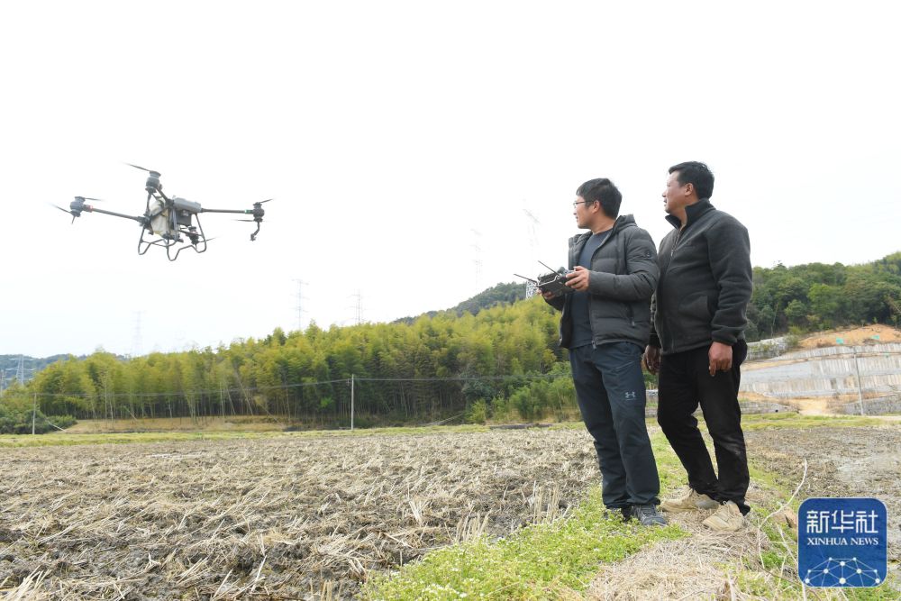 ↑2月28日,在浙江省绍兴市富盛镇青马村,大学生农创客唐海峰(左)操作无人机进行冬闲田除草。新华社记者 翁忻旸 摄
