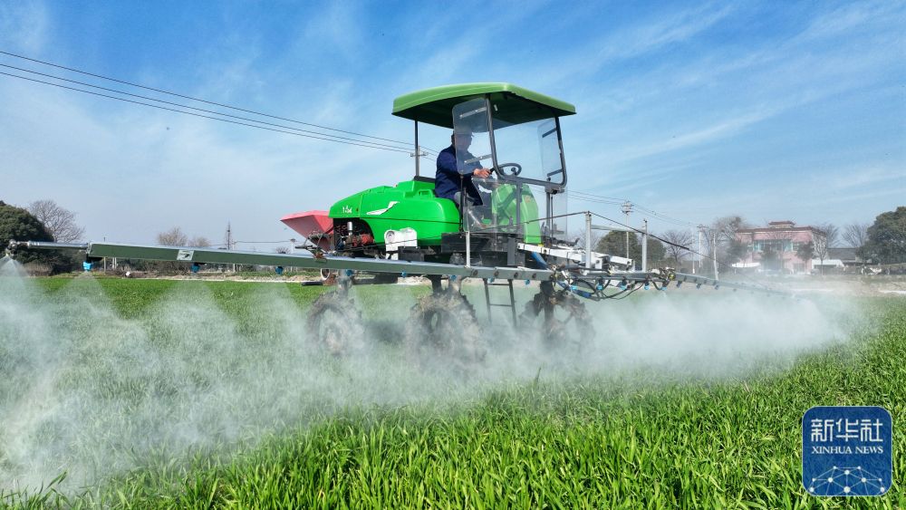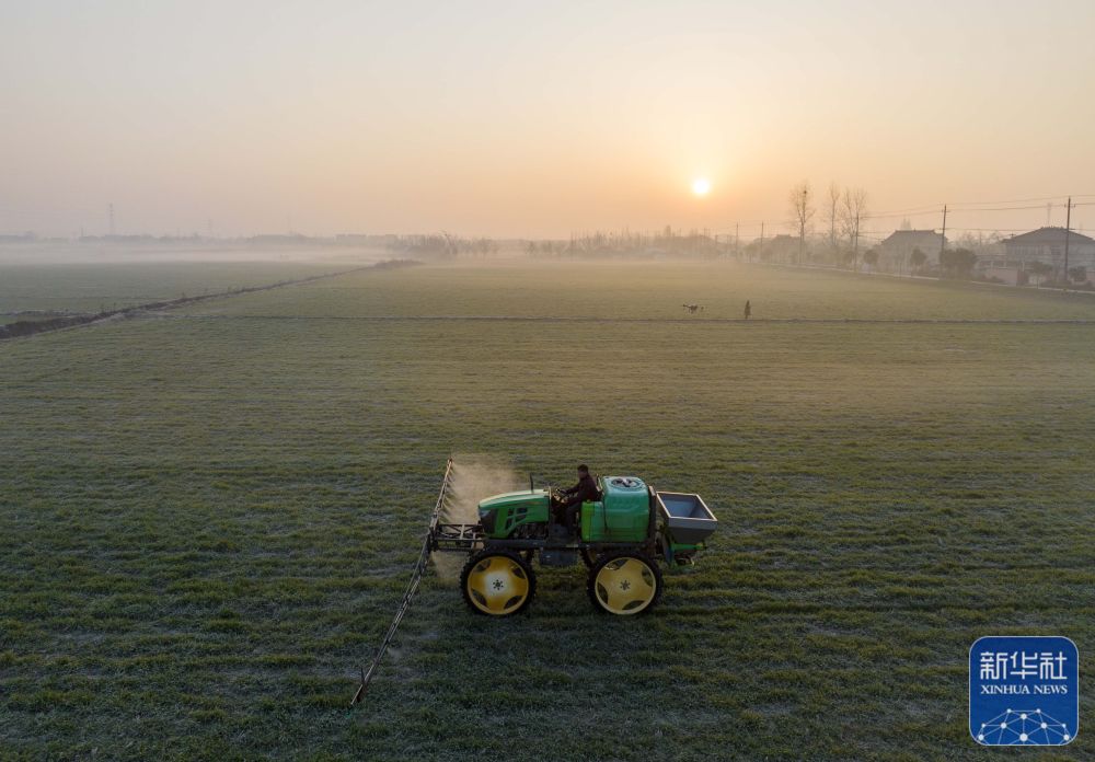 ↑2月28日,在江苏省泰州市姜堰区顾高镇塘桥村松青家庭农场小麦田间,农户驾驶植保机进行喷药作业(无人机照片)。新华社发(汤德宏 摄)