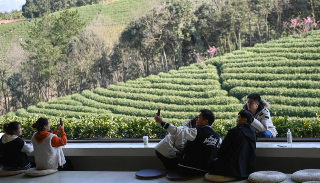 △游客在浙江省安吉县黄杜村万亩茶园边的咖啡馆留影(2月21日摄)。
